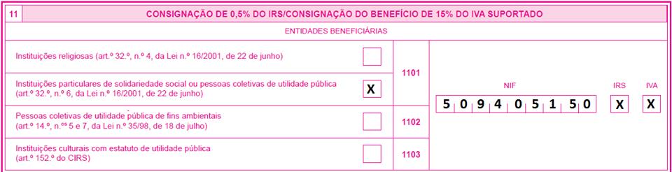 Além de 0,5% do IRS, pode também pode contribuir com a dedução de 15% do IVA suportado. Se desejares contribuir com ambos apoios deve marcar os espaços "IRS" e "IVA". Para contribuir apenas com a doação de 0,5% marque apenas o espaço "IRS".